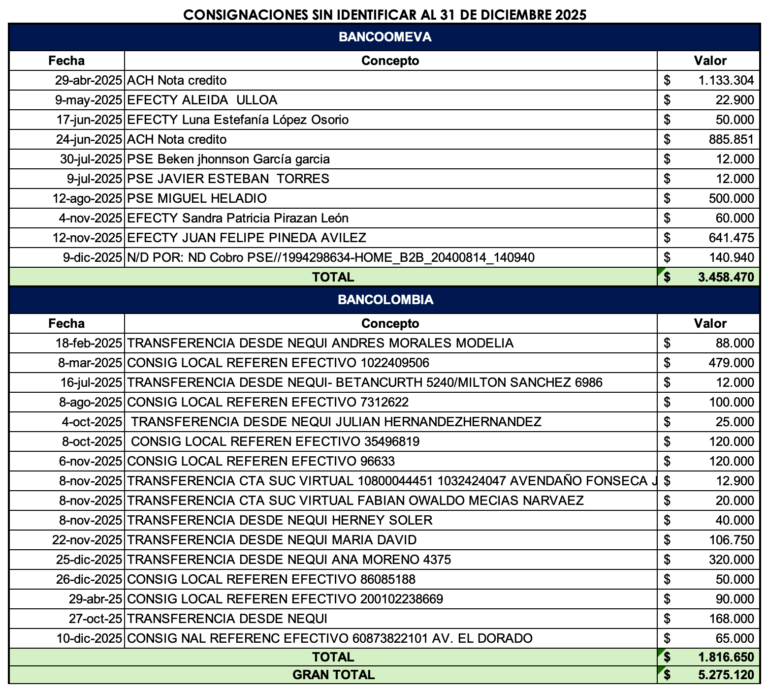 Informamos a nuestros asociados que tenemos las siguientes consignaciones y/o transferencia sin identificar.
